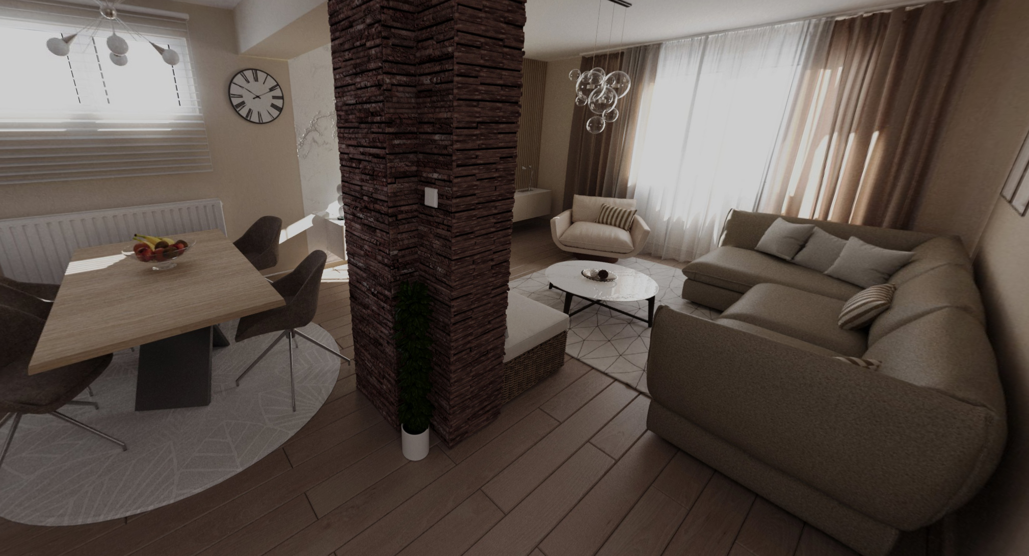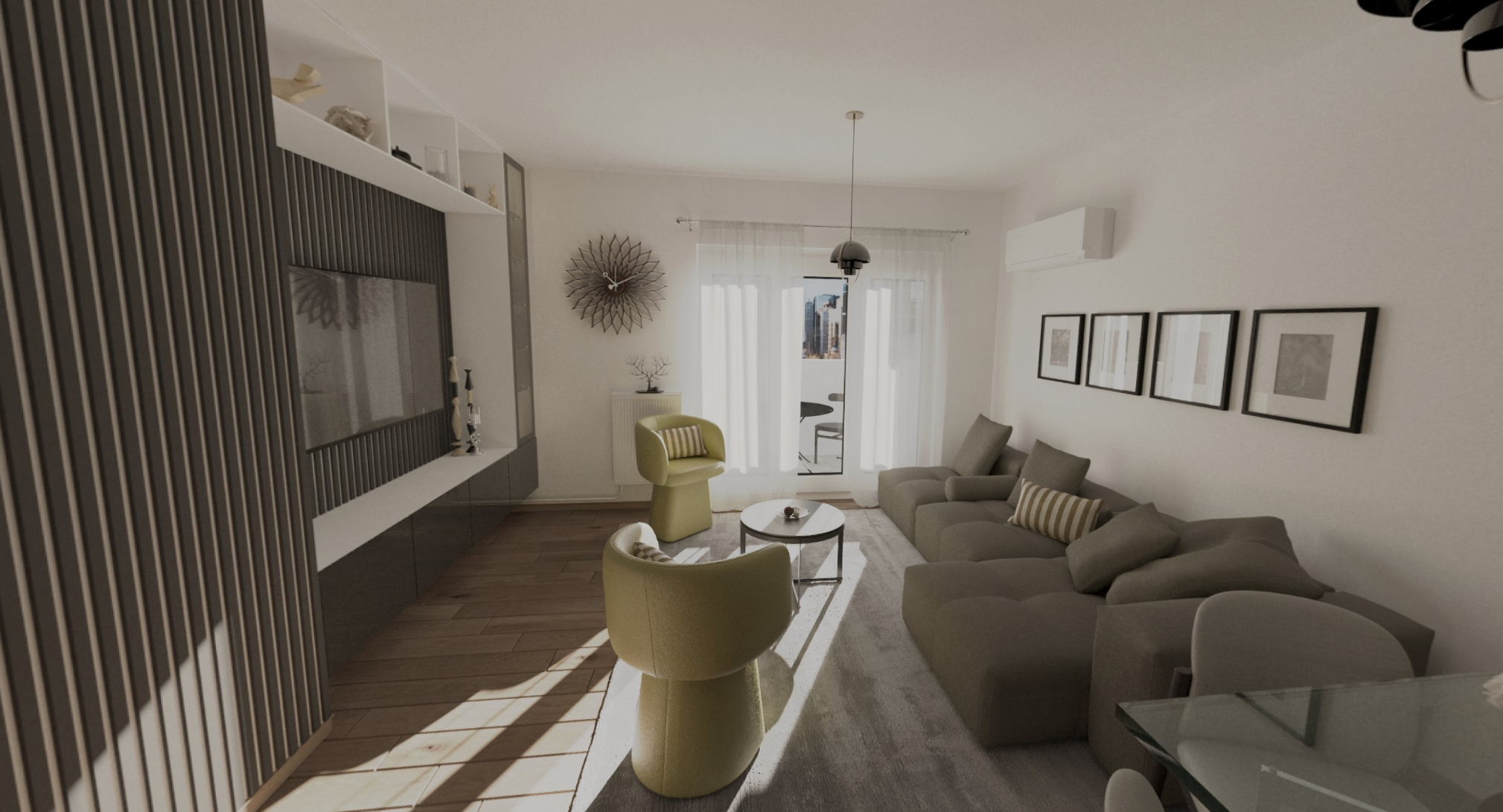 Ovaj jednosoban stan od 54 m² odlikuje moderan, tamniji dizajn koji stvara prijatan, elegantan ambijent. Dnevni boravak, trpezarija i kuhinja spojeni su u jednu funkcionalnu celinu, sa naglaskom na tamne tonove i čist minimalizam. Kontrast prostoru daju svetlije drvene letvice koje unose toplinu i vizuelnu dinamiku, naglašavajući zidne površine i zoniranje enterijera. Spavaća soba je prostrana i udobna, dok je kupatilo moderno opremljeno i usklađeno sa ostatkom stana. Ukupni utisak je savremeni, skladan prostor idealan za urban način života.